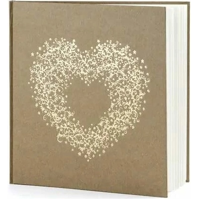 Kniha hostů svatební s elegantními tiskem:Rozměr: 20,5 x 20,5 cmListů: 22 listůBarva: přírodní hnědá se zlatým tiskem srdce
