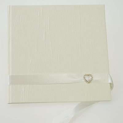 Svatební kniha o velikosti 20 x 20 cm v bílé barvě s bílou širokou atlasovou stuhou a štrasovou ozdobou bude důležitou součástí Vaší svatby.Kniha obsahuje 20 listů ( 40 stran...