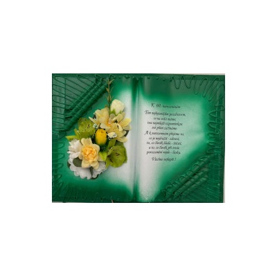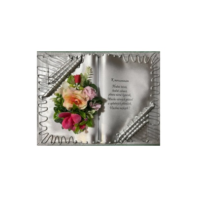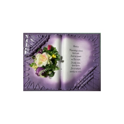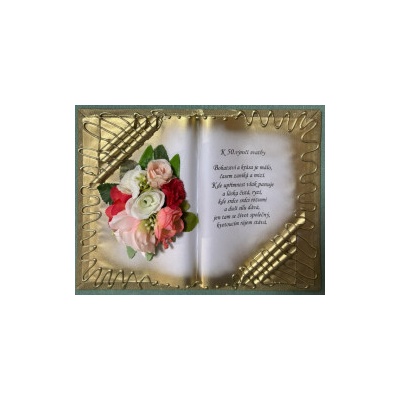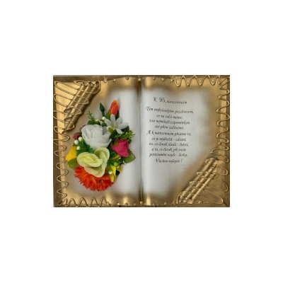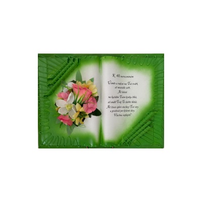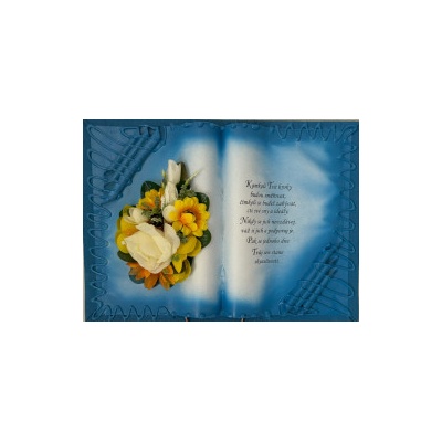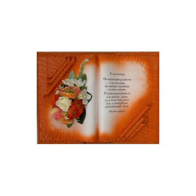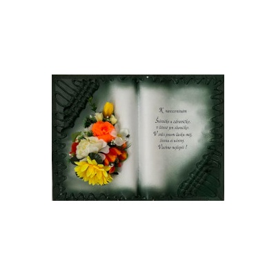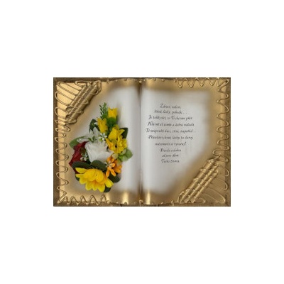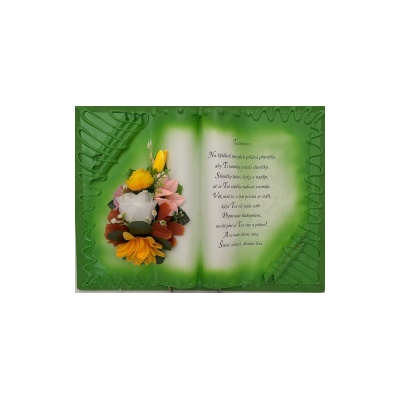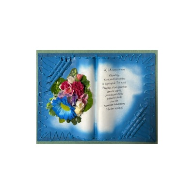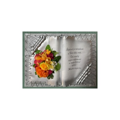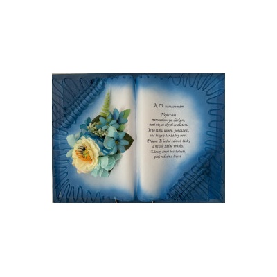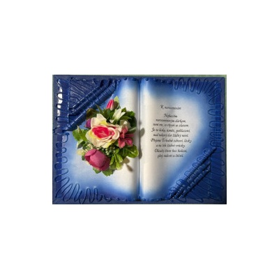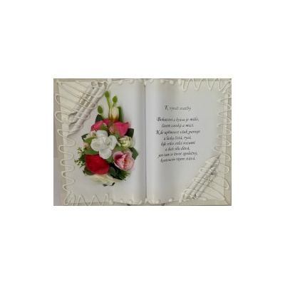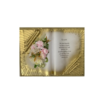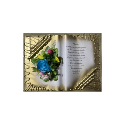 Kniha balená v průsvitném celofánu, na stojánku, převázanou mašličkou postavená na měděném stojánku.