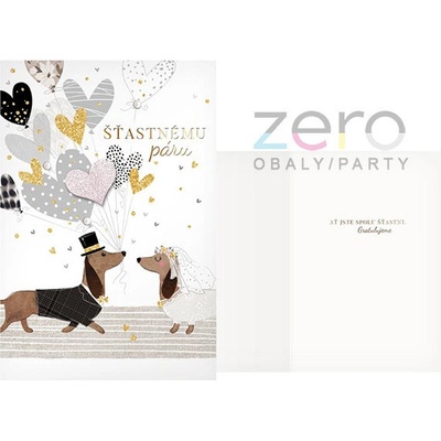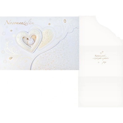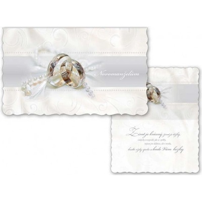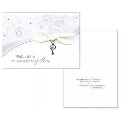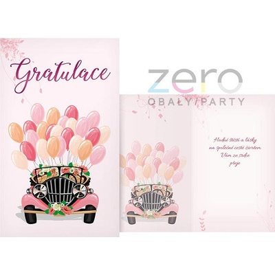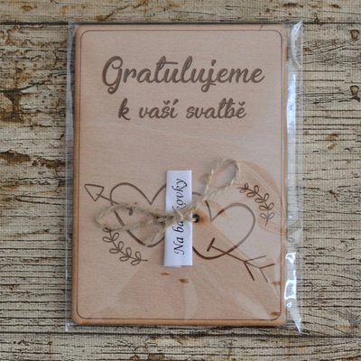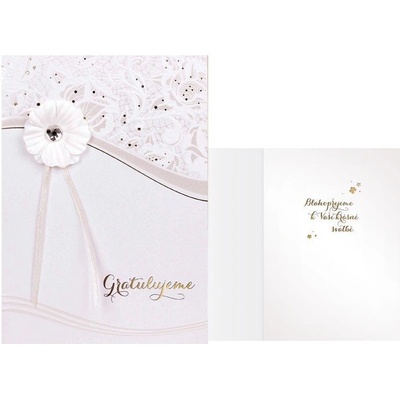 Text na přední straně přání: Gratulujeme Text uvnitř přání: Blahopřejeme k Vaši krásné svatbě. Papír: pohlednicový karton 240 g Přání je baleno v sáčku. Součástí přání je i...
