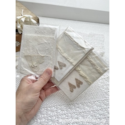 Jednoduché, decentní blahopřání vhodné k jakékoli svatbě nebo i jiné oslavě. Přání je celé z ručního morušového papíru v bílo-smetanovém reliéfním dekoru, zdobeno srdcem z...
