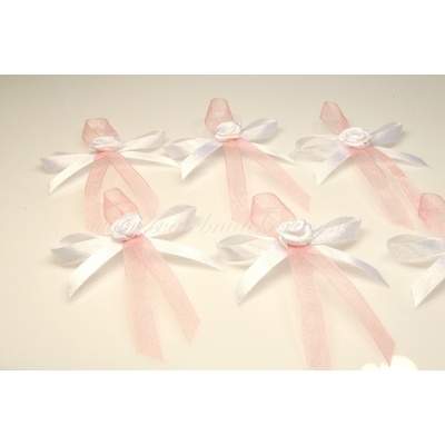 materiál: stuha, textilní růžička, špendlík barva: bílá, růžová způsob připnutí: špendlík na zadní straně