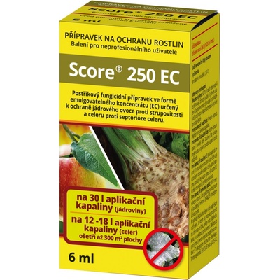 SCORE 250 EC - (exspirace 03.2026) je systémový fungicidní postřik určený k ochraně jádrovin a celeru proti strupovitosti, padlí, rzem a skvrnitostem na okrasných a ovocných rostlinách a dále pro použití v jahodníku a maliníku /ostružiníku. Obsah: difenokonazol 250...