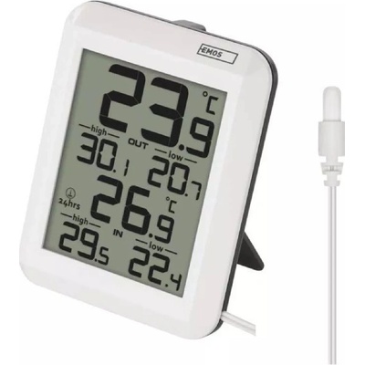 Drátový teploměr EMOS E0422 se zobrazením venkovní a vnitřní teploty, zaznamenává min. a max. teplotu. Teploměr má drátovou sondu dlouhou 0,9 m.