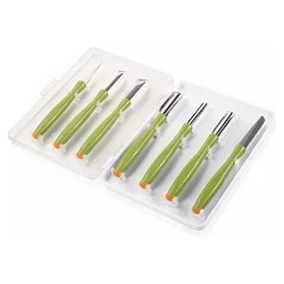 Je vynikající pro dekorování zeleniny a ovoce – mrkve, bílé ředkve a ředkviček, okurek, cuket, pórku, dýně, jablek, hrušek, manga, melounů atd. Souprava obsahuje 6 speciálních vykrajovacích nožů, speciálně tvarovaný keramický brousek a krabičku pro bezpečné uložení....