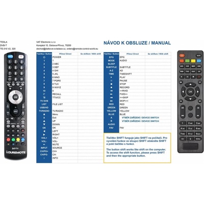 Dálkový ovladač TESLA TE310 V2 duplikát 1:1 originálního dálkového ovladače. Dokonalá 1:1 kopie navržená a vyrobená naší firmou – má všechny funkce originálního ovladače pro tyto modely značky TESLA:TE-310 V2, TE-320 V1, TE310 V2. (Nemusí zde být uvedeny úplně všechny...