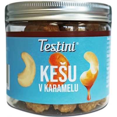Kešu v karamelu 90 g – TESTINI jsou lahodné pražené kešu ořechy obalené v křupavé vrstvě tradičního karamelu. Spojení jemné máslové chuti kešu s bohatou sladkostí karamelu vytváří dokonale vyvážený snack pro každou příležitost. Díky praktické uzavíratelné dóze...