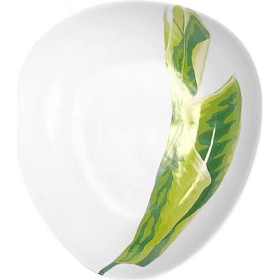 Keramický hluboký talíř se zeleným dekorem listů banánovníku, Ginkgo. Polévkový talíř má oblé tvary a trojuhelníkový tvar. Často říkáme, že žijeme v městské džungli. Pravá...