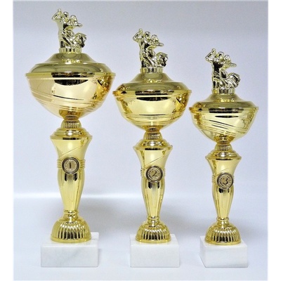 X23-P039. Poháry s pořadím viz. další foto. Výška pohárů včetně figurky je uvedena za lomítkem katalogového čísla. Průměr kalichů je 16, 14, 12 cm. Při nákupu jedné sady...