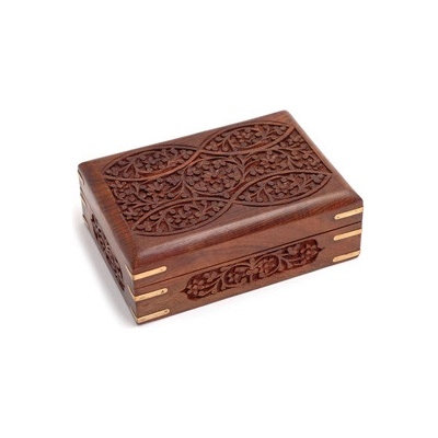 Dřevěná krabice, zdobená řezbou a mosaznými částmi, je určena pro ukládání andělských, tarotových či jiných vykládacích karet, může však sloužit i jako šperkovnice. Otevírání na...