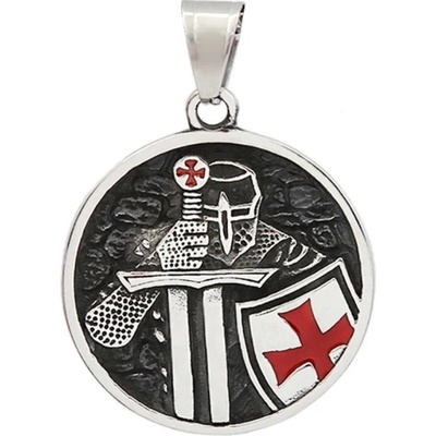 Ocelový náhrdelník a přívěšek Templářský rytíř, co má štít a meč a na něm červený templářský kříž. Řád templářů byl mocný křesťanský rytířský řád středověku.