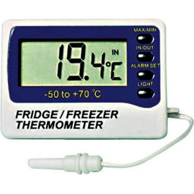 Digitální teploměr se sondou. Vhodný k umístění do lednice, mrazáku, možnost nastavení měření teploty v lednici (funkce "FRIDGE") nebo v místnosti (funkce "ROOM"). Nastavení alarmu pro indikaci nastavitelných MIN/MAX hodnot, signalizace každou minutu.