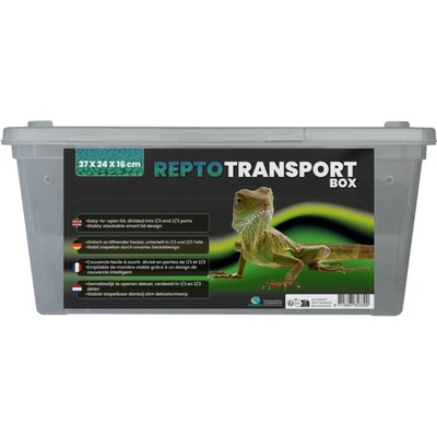 Repto Transport Box 37x24x16 cm REPTO plastová dóza v transparentní barvě s lomeným víčkem a větracími otvory (Ø 4 mm) v bočních stěnách a ve víčku. Uvnitř se navíc nachází...