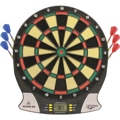 Elektronický terč CARROMCO Score 301 Technická data: - čtyřřádkový elektronický terč - lapací plocha okolo terče pro nepřesné hody - zvukové efekty - 26 her - 523 herních...