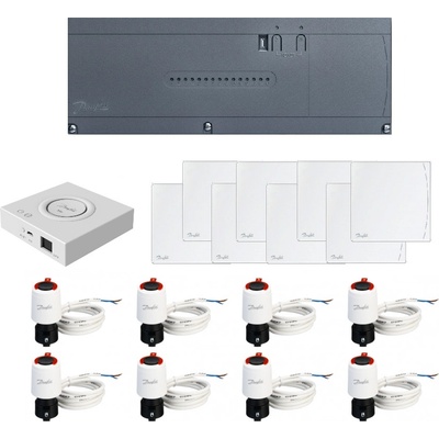 Sada Danfoss Icon pro regulaci podlahového vytápění s bezdrátovým propojením. Obsahuje řídící regulátor, 8 bezdrátové čidla, 8 termoelektrické pohony a Ally Gateway.