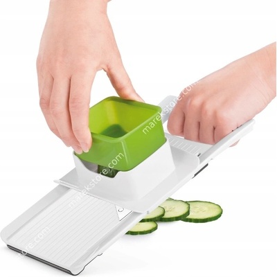 Struhadlo s multifunkčním úchytem pro komfortní a bezpečné plátkování bez rizika poranění. Ostrá nerezová čepel s nastavitelnou silou plátku 1, 2 a 3 mm. Vhodné do myčky.