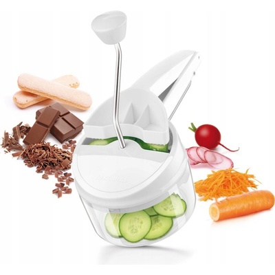 Nůž a struhadla jsou vyrobeny z prvotřídní nerezavějící oceli, ostatní části z odolného plastu, 5 výměnných struhadel + 2 velikosti hranolků, nastavitelná síla plátku 1 až 6 mm,...