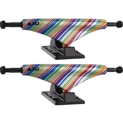Trucky Theeve V3 CSX Rainbow mají odlehčený ocelový kingping a ocelovou osičku, lehčí váha než je dosažena příměsí titanu v samotném trucku. Součástí trucků jsou silentbloky...