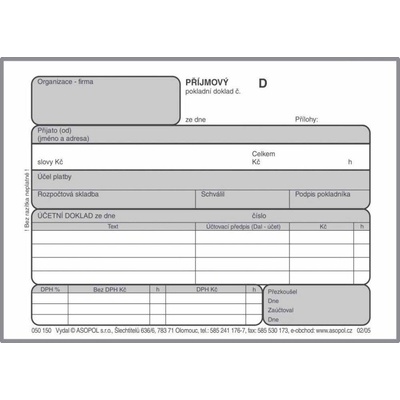 Příjmový pokladní doklad s DPH i pro podvojné účetnictví, nečíslovaný. Blok A6/100l.
