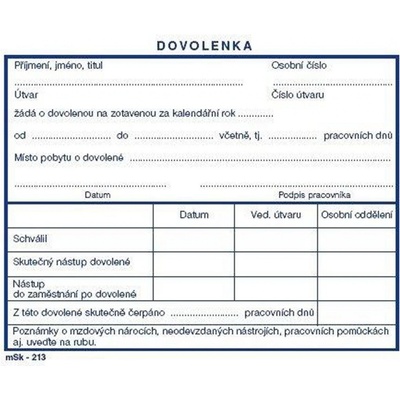Detaily Tiskopis určený pro přehledné vyplnění doby nástupu a ukončení zákonné dovolené. Další informace Provedení lepený blok 100 listů, A6 na šířku