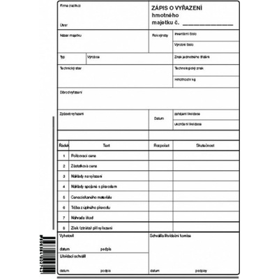 Zápis o vyřazení základních prostředků OP 1274.Volný list. Nepropisující. Formát A5.