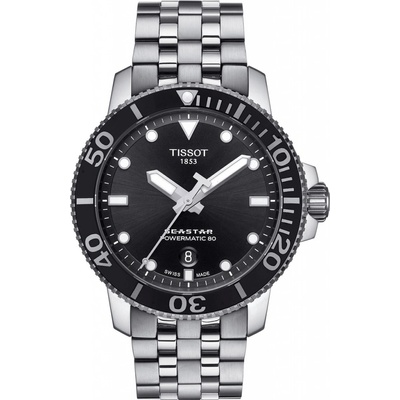 luxusní hodinky Tissot Seastar 1000 PROFESSIONAL Powermatic 80, 43 mm. Hodinky disponují funkcemi luminiscence a ukazatel data. Základní parametry hodinek jsou: materiál řemínku je ocel, barva číselníku je černá, typ strojku je mechanické hodinky s automatickým nátahem...