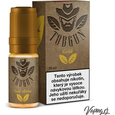Tabákový e-liquid TobGun - GOLD 10ml PG30/VG70 Obsah nikotinu: 1.5mg, 3mg, 6mg, 12mg a 18mg Poměr PG/VG: 30/70 Obsah balení: 10ml S TobGun Gold na vás čeká jemná tabáková příchuť s lehce zemitými tóny, která se jen tak neomrzí a každý potah přináší vynikající požitek...