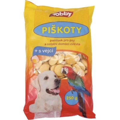 Tobby piškoty Piškoty pro psy s nízkým obsahem cukru a lepku,s obsahem vaječné melanže (8%). Křupavý pamlsek pro zpestření stravy.Vhodné k navykání štěňat na tuhou stravu,nebo část denní dávky(max. Ľ) pro zvířata trpící dočasným nechutenstvím či rekonvalescenty.Velice...