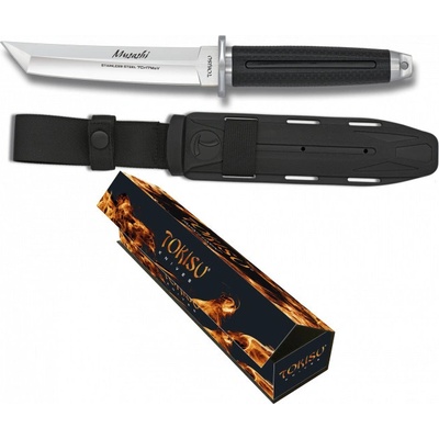 Kompaktní štíhlý nůž Tokisu 32390 Musashi, čepel tvaru tanto, full tang konstrukce, výrazná záštita, gumová protiskluzová rukojeť, velmi variabilní plastové pouzdro.