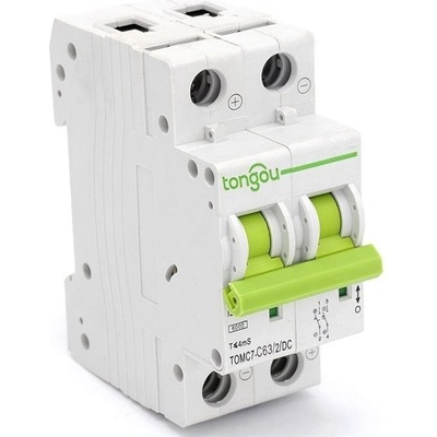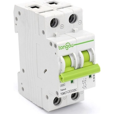 Jistič DC 40A/C 2P Tongou TOMC7-63 na DIN lištuJistič pro DC napětí se používá především ve spojení s fotovoltaickými panely. **Specifikace:** model: TOMC7-63/2/C63/DC Počet pólů: 2 Jmenovité pracovní napětí: 440VDC Rozsah použitelného napětí: 12-500VDC Jmenovitý proud...