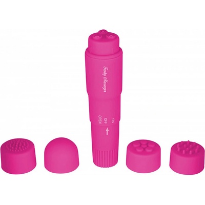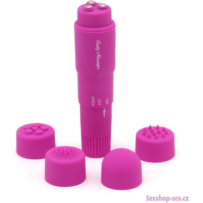 Růžový kapesní stimulátor s vibrací a 4 - mi vyměnitelnými nástavci. Délka: 10 cm Průměr: 2,5 cm