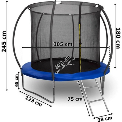 Zahradní trampolína 312 cm (10 stop) Sada obsahuje: - 312 cm (10 stop) trampolína na 3 dvojitých nohách - pevný kovový žebřík - vnější (bezpečnostní) síť - zapnutá na...
