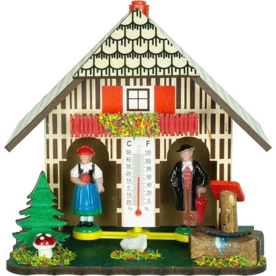 Barometr v podobě dřevěné pestrobarevné chaloupky. Bude-li hezky z chaloupky vystoupí panenka. Bude-li ošklivé počasí ukáže se panáček. Klasika Materiál: dřevo Teploměr Teplota (Celsius nebo Fahrenheit) Předpověď počasí