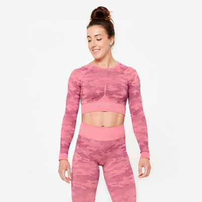Dámské tričko s dlouhým rukávem s maskovacím potiskem odvádí pot a zároveň je na cvičení velmi stylové. Tričko střihu crop top v seamless (bezešvém) provedení obepne vaši...