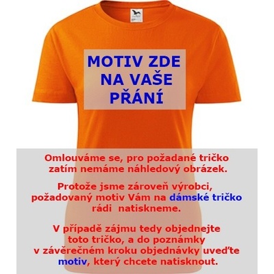 Oranžové dámské tričko s motivem na přání. nabízené velikosti jsou S,M,L,XL,XXL. Výběr z 12ti barev. Tričko patří do kategorií . Technologie potisku: Tisk na tričko je...