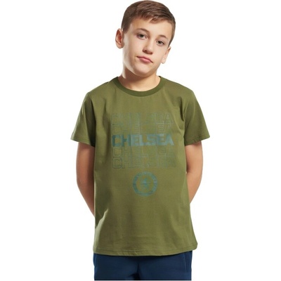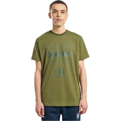 Olivové fanouškovské tričko Chelsea FC s krátkým rukávem a kulatým výstřihem. Vpředu je opakovaný nápis CHELSEA a klubový znak v dolní části motivu. Průkrčník má žebrovaný lem,...