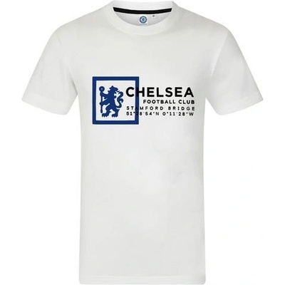 Bílé dětské tričko Chelsea FC s netypickým designem na hrudi - klubový znak v rámečku, název klubu a stadionu, souřadnice stadionu.Příjemný materiál, který se bude pohodlně...