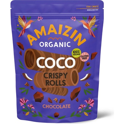 Amaizin Trubičky kokosové s čokoládou Bio Amaizin kokosové trubičky s čokoládou v sobě spojují jemnost a křupavost v dokonalé rovnováze. Každé sousto nabízí harmonii bio...