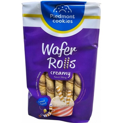 Vaflové trubičky s krémem se smetanovou chutí. SLOŽENÍ: - Těsto: PŠENIČNÁ mouka, voda, cukr, odtučněné sušené mléko, glukóza, maltodextrin, řepkový olej, barvivo: amoniakální...