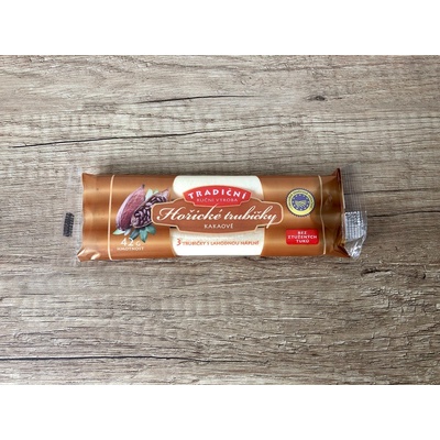 Hořické trubičky kakaové 42g Tradiční oblíbená pochoutka Složení: Oplatka: - Pšeničná mouka, sušené mléko, rostlinný olej řepkový. - Cukr, sušené žloutky. Kakaová náplň:...
