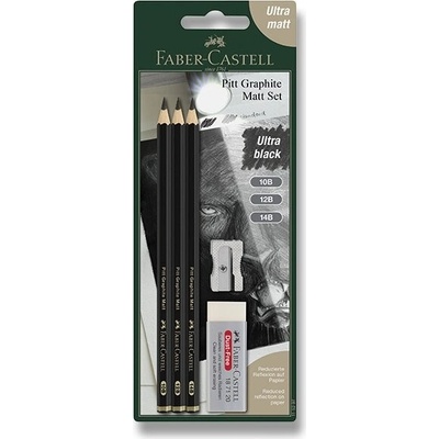Sada 3 grafitových tužek Faber-Castell Pitt Graphite Matt o různých tvrdostech, ořezávátka a pryže.