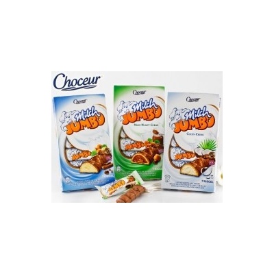 Choceur-Milch Jumbo,kokosové tyčinky,7 ks,150 g. Lehké oplatky s jemnou kokoso-mléčnou krémovou náplní, pokryté delikátní mléčnou čokoládou. Dovezeno z Německa.