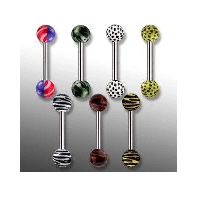 Piercing do jazyka zakončený různými motivy.