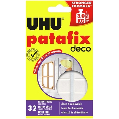 UHU Patafix je samolepící snímatelná guma, díky které můžete přichytit lehké předměty, plakáty a fotografie téměř na všechny povrchy (například stěny, nábytek, skla, zrcadla a další). Není třeba nic vrtat ani zatloukat a zároveň je minimální riziko poškození povrchu....