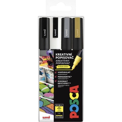 Rozmanitá sada 4 inkoustových fixů Uni POSCA PC-5M na vodní bázi v jednobarevných barvách. Píše prakticky na jakýkoli povrch bez prosakování papíru. Polyesterový hrot ve tvaru kulky píše čáru cca 0,9-1,3 mm. Sada obsahuje po jedné černé, bílé, stříbrné a zlaté. POSCA...