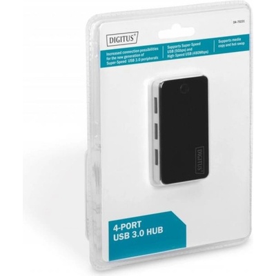 DIGITUS USB 3.0, 4-ports HUB, 4xUSB A/F,1xUSB A/F, Cable AM/AM 1.2M incl. Power Supply 5V 4A Increased connection possibilities for the new generation of Super-Speed USB 3.0...