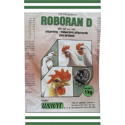Univit S.r.o. Roboran D přísada do krmiva pro slepice, kuřata, krůty, perličky, kachny a husy, 1 kg Doplňuje krmnou dávku o vitamíny, nepostradatelné aminokyseliny metionin a lyzin, makrominerální a mikrominerální látky (Fe, Cu, Zn, Mn, J, Co, Mg, Se) a krmnou sůl v...