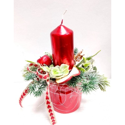 Vánoční svícen v keramické nádobě. Umělé větvičky jsou vypichovány do aranžérské hmoty. Polystyrenové jablíčko, dřevěný koník, šiška a sušené plody lepeny. Svíčka je na kovovém...