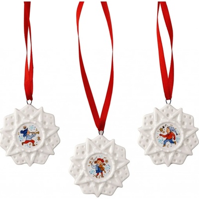 Tři roztomile malé porcelánové závěsné ozdoby o průměru 6 cm, každá jiného tvaru a s jiným motivem. Vhodné jako dekorace na stůl nebo k zavěšení do okna či na stromeček. Ozdoby...