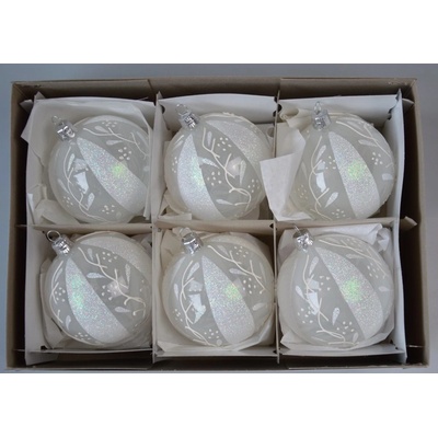 Skleněná vánoční ozdoba, koule hladká. Barva: bílá průhledná, dekor lesk. Velikost koule: 8 cm Kusů v balení : 6 ks Česká výroba Cena za 6 kusů!